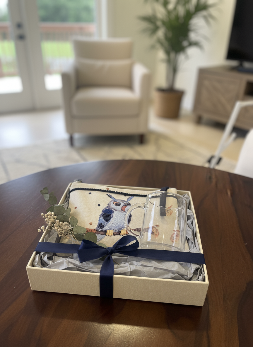 Owl printed & hand embroidered utility pouch with Owl printed glass coffee mug.