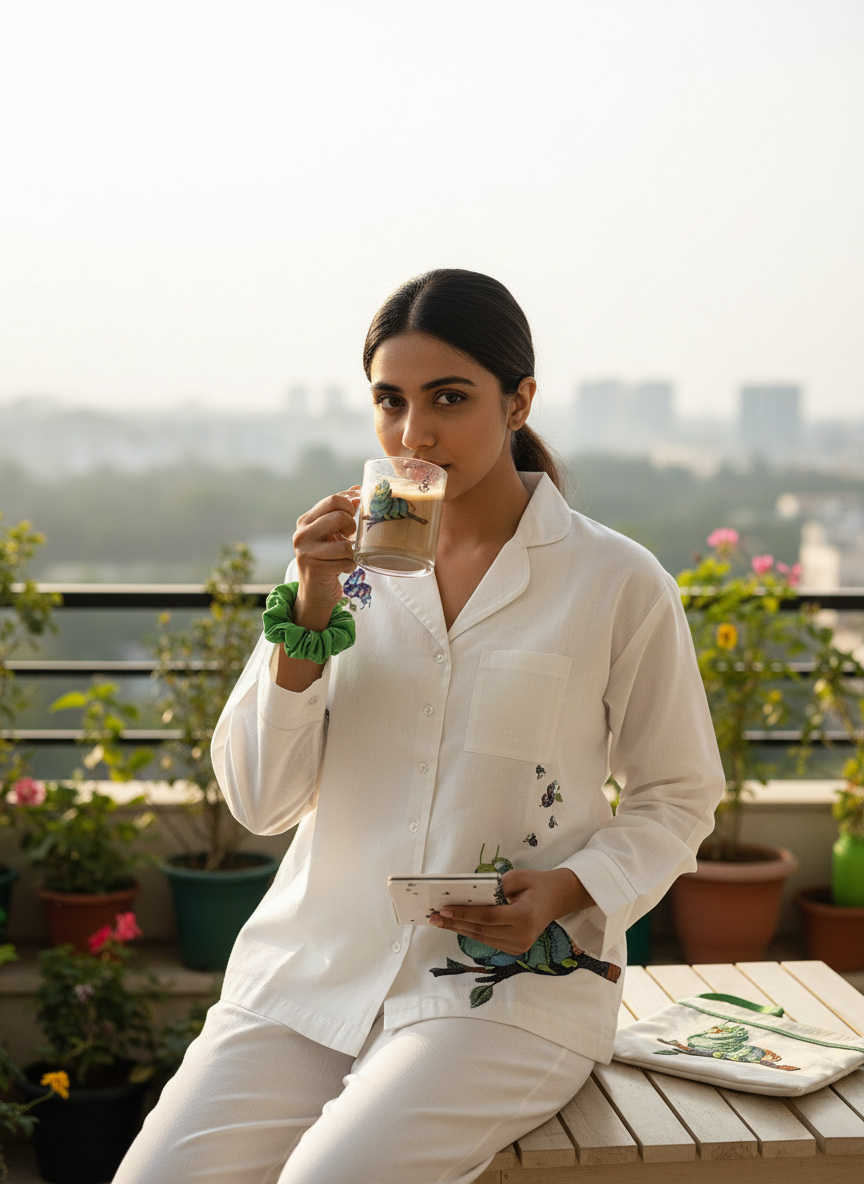 CATERPILLAR PRINTED & HAND EMBROIDERED PYJAMA SET.